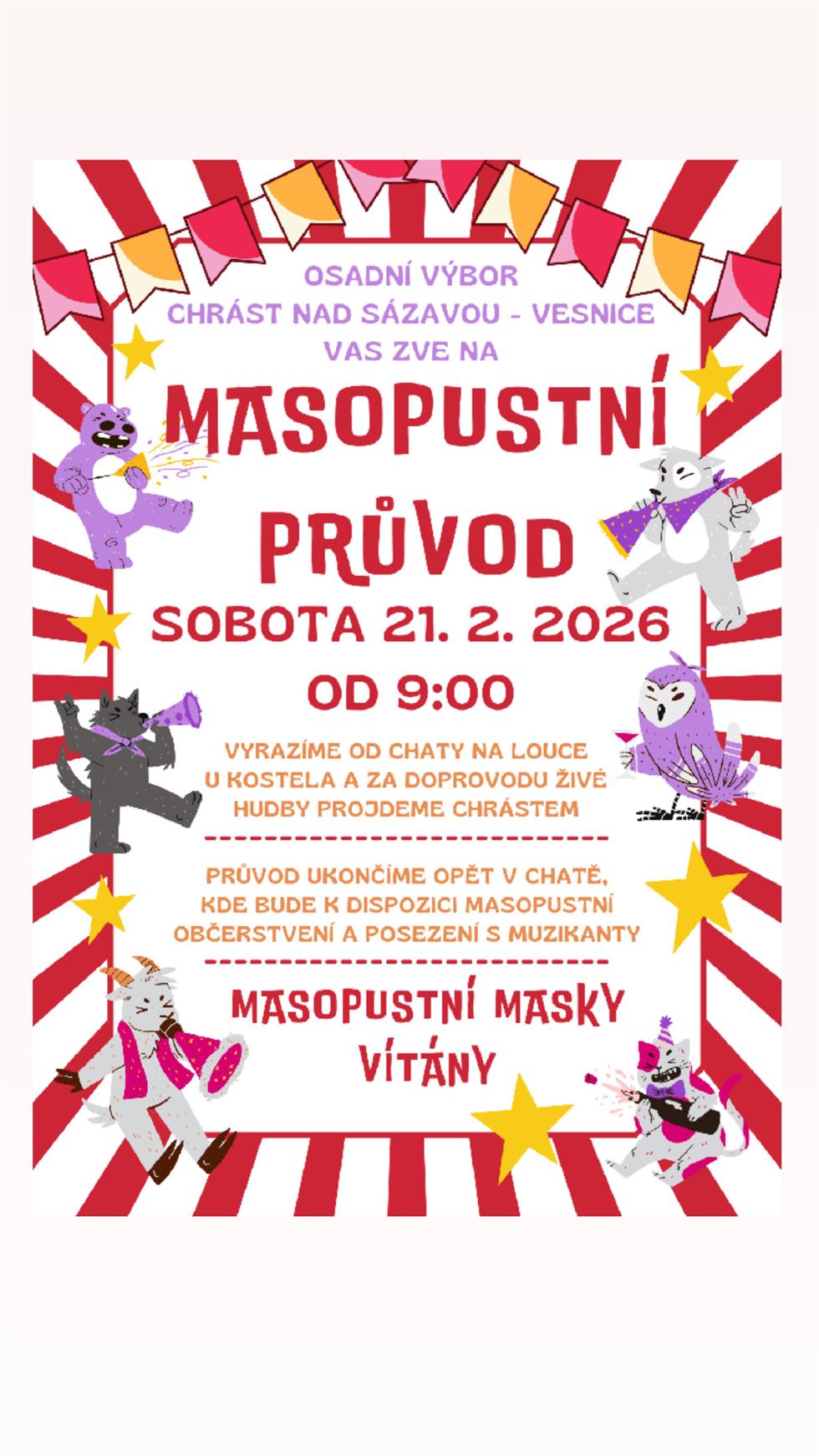 Osadní výbor Chrást nad Sázavou - vesnice Vás srdečně zve na masopustní průvod.